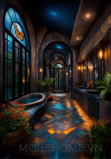 Với những đường nét tinh tế, không gian phòng tắm này mang lại cảm giác thư giãn và yên bình ngay khi bạn bước vào. Cửa sổ kính màu rực rỡ trên tường tạo nên một bức tranh sống động từ ánh sáng, chiếu vào căn phòng, khiến mọi thứ đều ngập tràn màu sắc. Mỗi tia sáng, mỗi mảnh kính màu hòa quyện với nhau, tạo nên một không gian như bước ra từ một câu chuyện thần thoại.