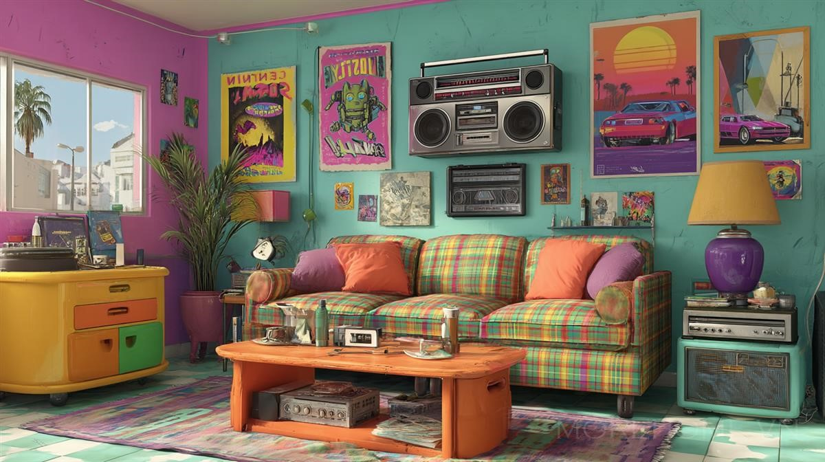 Phòng khách này như một chuyến du hành ngược thời gian, đưa chúng ta trở lại thập niên 90 với những biểu tượng văn hóa đặc trưng của thời kỳ đó. Một chiếc ghế sofa kẻ sọc plaid, mềm mại và dễ chịu, chiếm vị trí trung tâm, như mời gọi bạn ngồi xuống và thư giãn trong không gian tràn ngập màu sắc và âm thanh. Mỗi chi tiết đều được chăm chút tỉ mỉ để tạo ra một không gian sống đầy cảm hứng và sự hoài niệm.