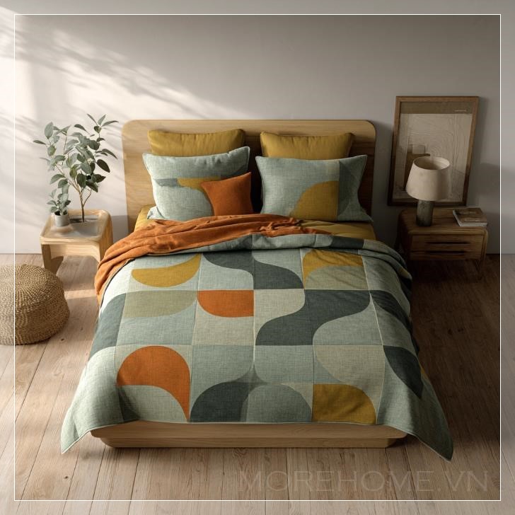 Phong cách Mid Century Modern, một biểu tượng của sự hiện đại và tinh tế, luôn thu hút sự chú ý bởi sự kết hợp giữa tính năng sử dụng và thẩm mỹ vượt thời gian. Trong thế giới thiết kế, chăn quilt (chăn chần bông) mang phong cách này đã trở thành một phần không thể thiếu, mang đến sự ấm cúng và một cảm giác vừa cổ điển, vừa mới mẻ. Chăn quilt phong cách Mid Century Modern không chỉ đơn thuần là vật dụng trang trí, mà còn là sự thể hiện của một thời kỳ nghệ thuật đặc sắc. Màu sắc của nó, với sự hòa quyện giữa màu xanh lá cây nhạt, cam bụi và vàng mù tạt, chính là một cách tái hiện lại vẻ đẹp tinh tế và đầy cảm hứng của thời kỳ này.