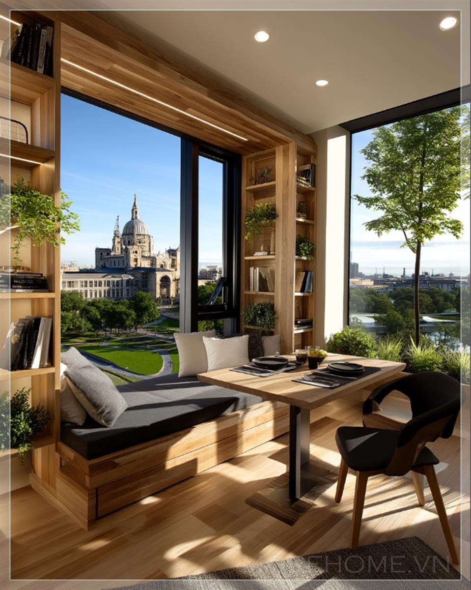 Không gian ăn uống nhỏ xinh với bàn ăn và hai ghế cạnh cửa sổ, mang đến một góc nhìn tuyệt đẹp ra ngoài thành phố. Đây không chỉ là nơi dùng bữa mà còn là nơi thư giãn, làm việc hay đọc sách. Mọi chi tiết đều được thiết kế để tạo cảm giác thoải mái, thư giãn, phù hợp với những cá nhân yêu thích một không gian sống đơn giản nhưng đầy đủ tiện nghi.