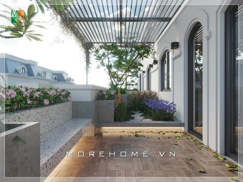 Ấn tượng với mẫu thiết kế lối đi hông nhà độc đáo, tinh tế với giàn hoa giấy khoe sắc hồng tươi tắn tô thêm vẻ đẹp quyến rũ cho biệt thự, nhà phố.