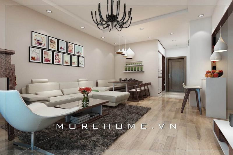 Khó cưỡng lại vẻ đẹp trẻ trung của thiết kế sofa góc hiện đại tinh tế với phần vỏ bọc da trắng sang trọng hài hòa trong không gian phòng khách căn hộ chung cư.