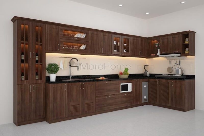 Thiết kế tủ bếp gỗ óc chó hiện đại giúp khách hàng tận dụng được diện tích và đáp ứng đầy đủ công năng khi sử dụng.