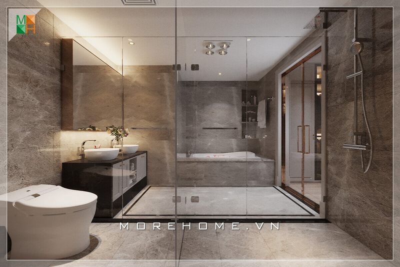 Mẫu thiết kế của nhà tắm và nhà vệ sinh sử dụng kính cường lực để tạo nên vẻ đẹp tinh tế và sang trọng.
